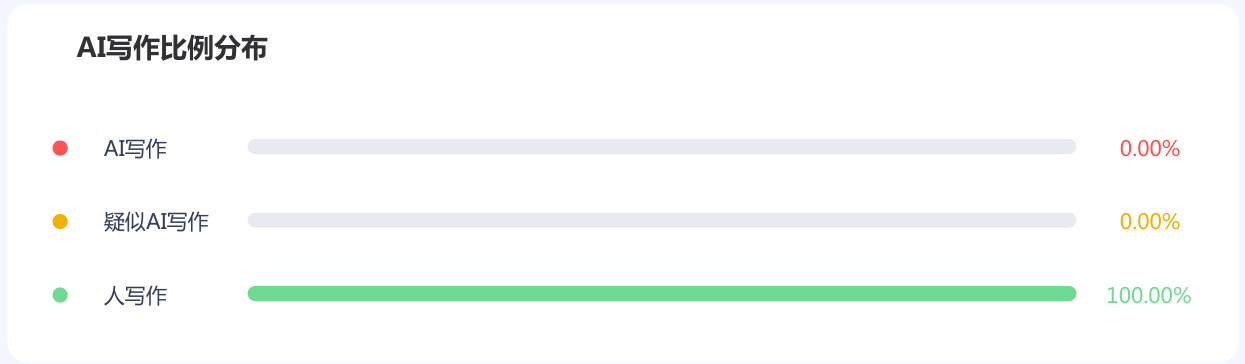 说的直白一些,就是论文原创度高,从开题到结尾都是由作者自己亲自撰写,完全没有借助到任何AI工具的帮助,那么AI率自然就是0%。