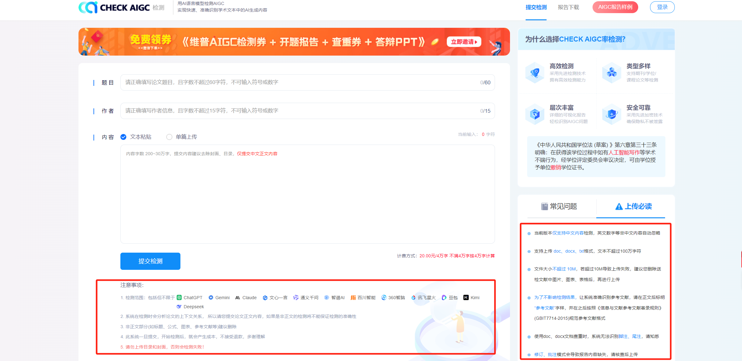 不论是论文查重或者AIGC查重前,仔细查看查重或检测系统的注意事项及必读内容。这可是帮助我们更准确的进行论文的检测的重要一步,只有了解清楚,才能确保论文AI检测的报告真实无误。大家可以通过下方图片了解AIGC检测系统的必知及注意事项: