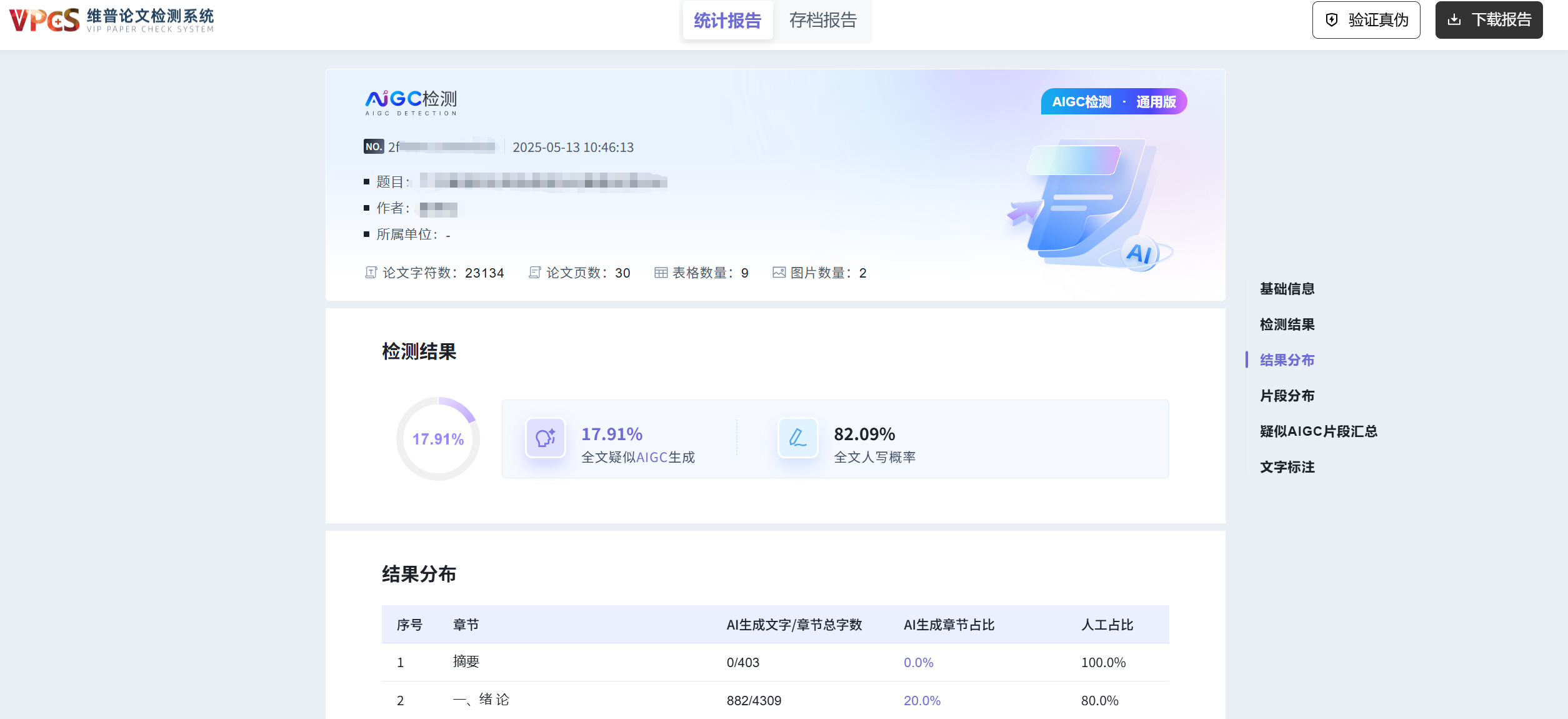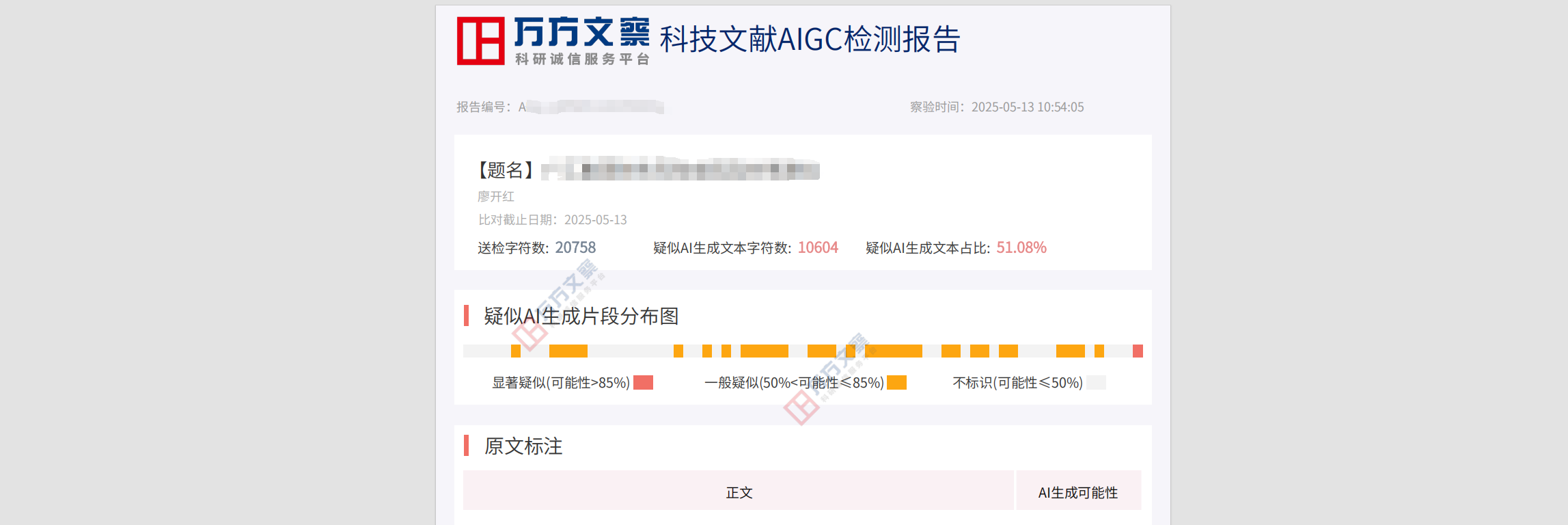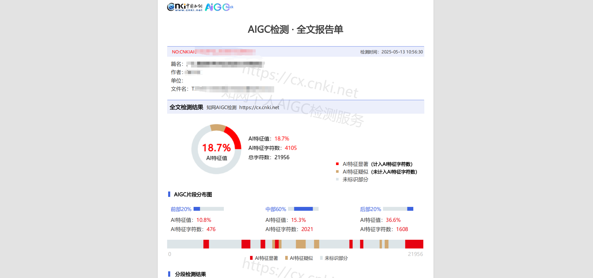 4、报告详细:报告不仅包含了全文AI率的占比,还有详细的段落及原文标红信息,帮助我们更好的理解和判断结果。