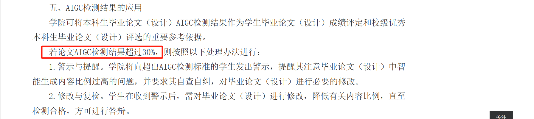 学校会通过一些AIGC检测系统对于论文进行检测,专门识别论文中存在的AI痕迹。但我们要清楚的是,AI检测结果也是有标准的。不同学校及不同专业对于AIGC检测结果标准也是不同的,通常一些学校对于论文AI率的要求30%以内,也有一些要求严格的可能要20%甚至15%以内,我们一定要清楚我们论文的超标红线是多少。